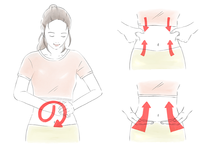 - 1 腸の内容物の進行方向に合わせて、お腹に「の」の字を描く